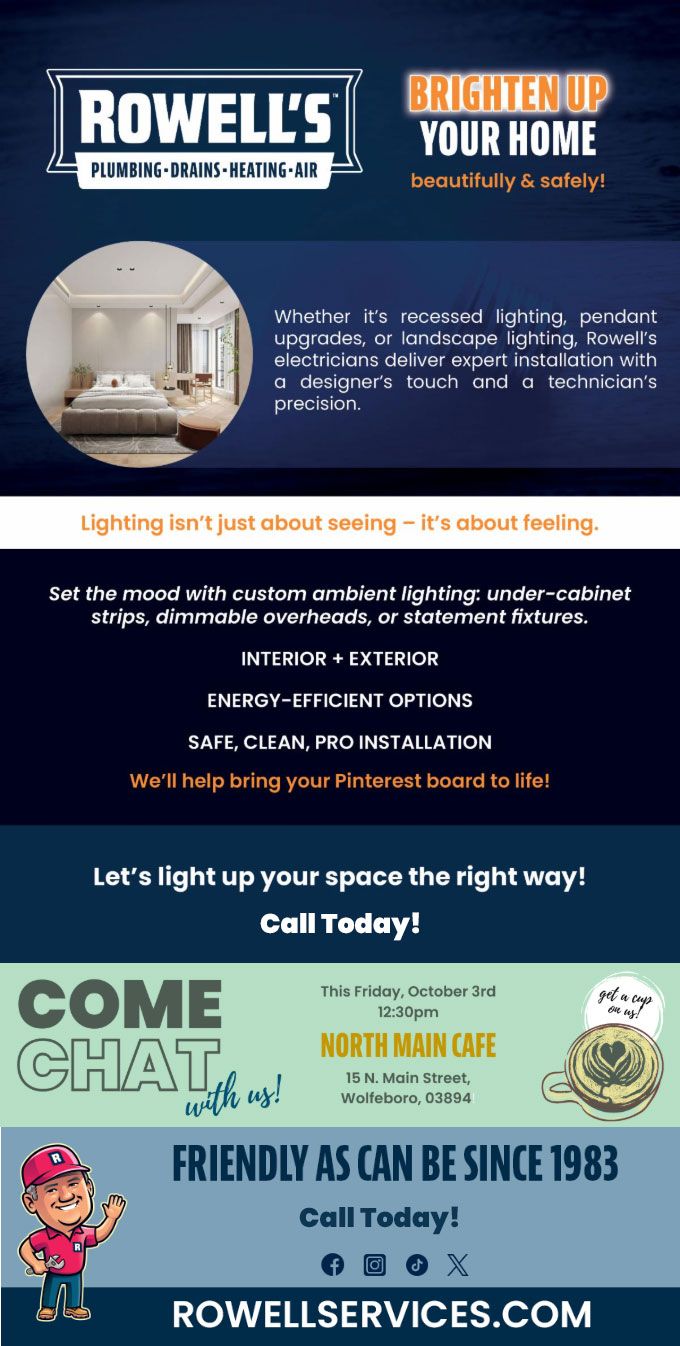 "Friendly As Can Be Since 1983!" When you need help with your plumbing, drains, heating, cooling or electrical in Rumney, you can always rely on Rowell's Services! Call us now or book online!
