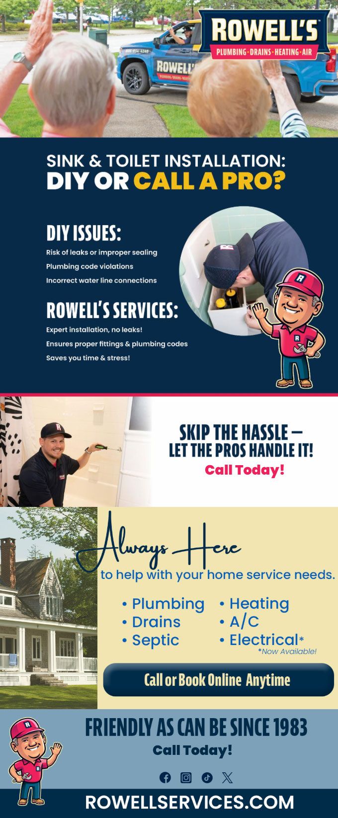 "Friendly As Can Be Since 1983!" When you need help with your plumbing, drains, heating, cooling or electrical in Rumney, you can always rely on Rowell's Services! Call us now or book online!